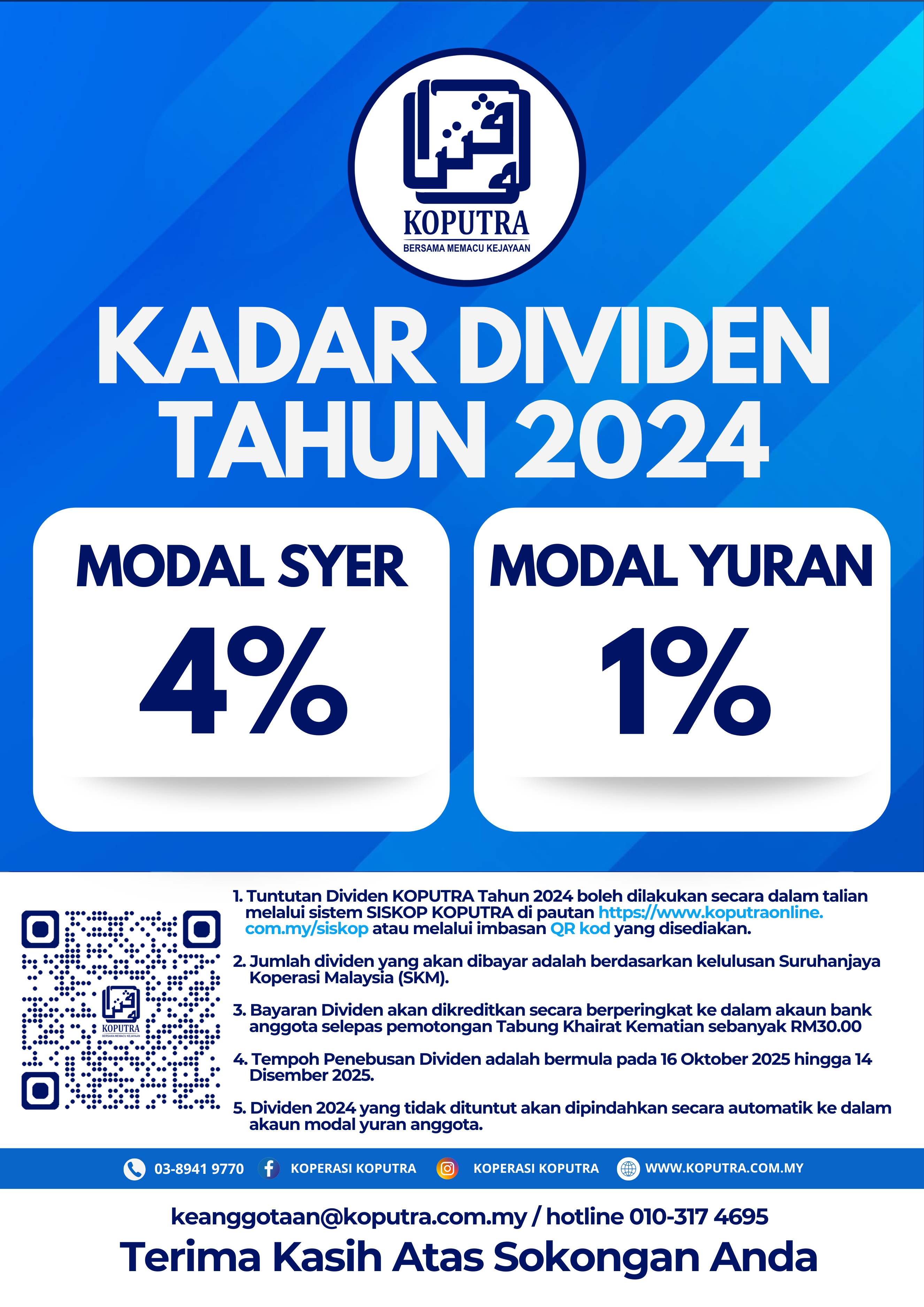 Maka dengan itu bermula 16 Oktober 2025 anggota KOPUTRA dibolehkan memohon tuntutan dividen melalui portal SISKOP (www.koputraonline.com.my/siskop).