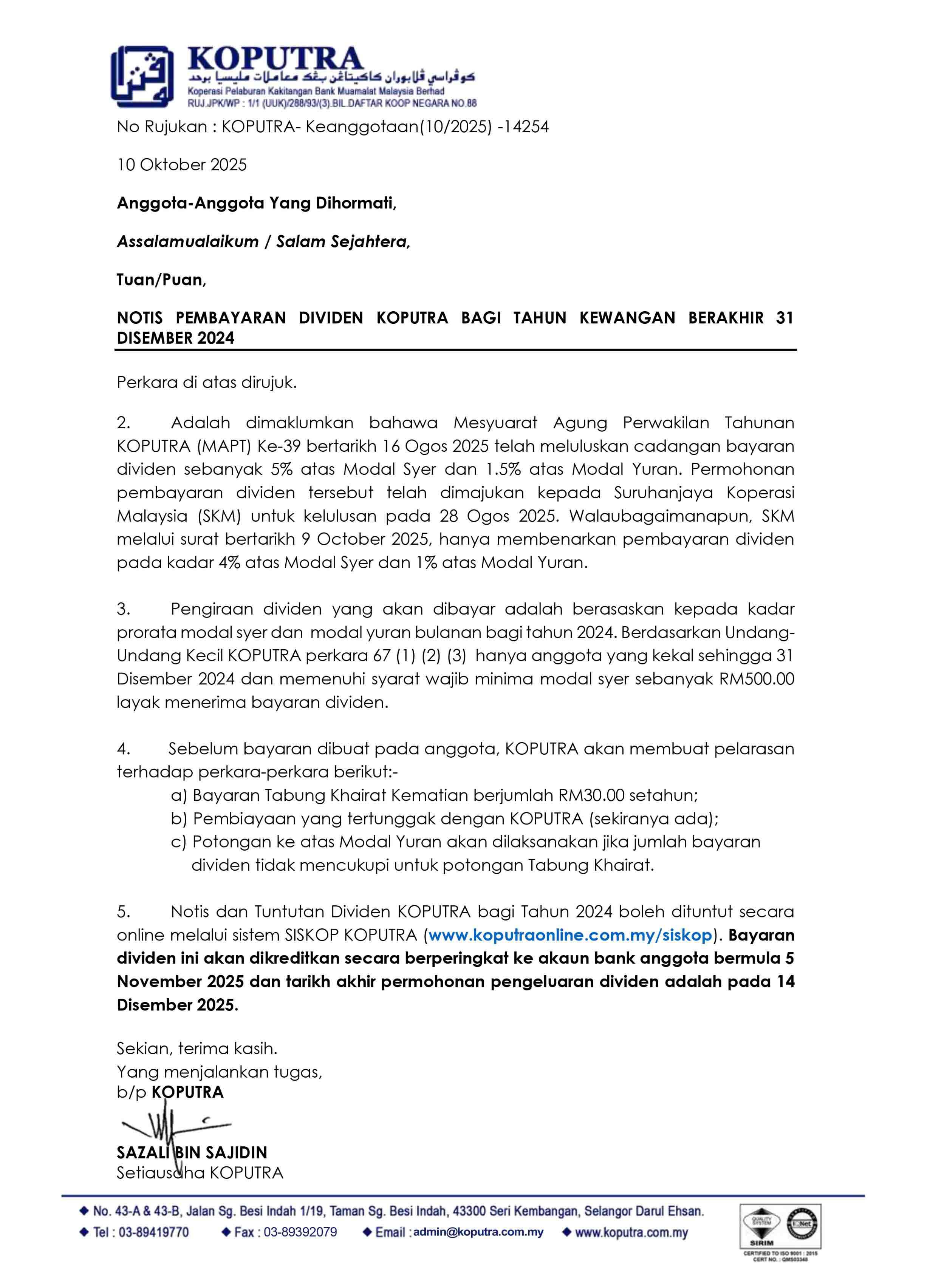 Adalah dimaklumkan bahawa Mesyuarat Agung Perwakilan Tahunan KOPUTRA (MAPT) Ke-39 bertarikh 16 Ogos 2025 telah meluluskan cadangan bayaran dividen sebanyak 5% atas Modal Syer dan 1.5% atas Modal Yuran.